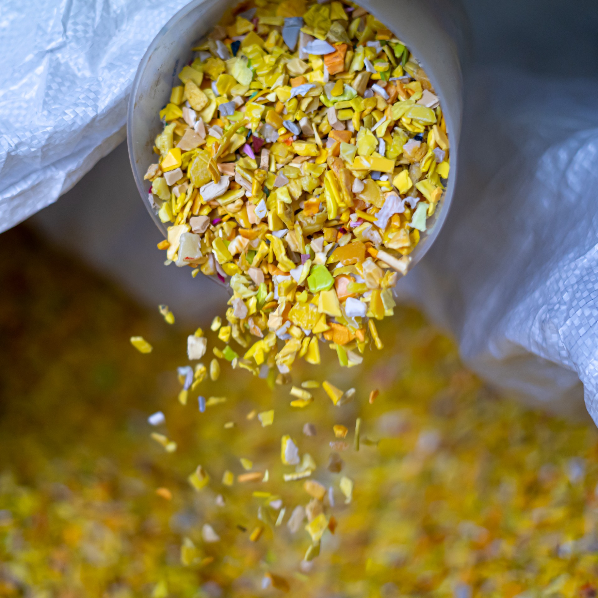Gerecycled plastic granulaat (PP, in de kleuren zwart, wit, blauw, groen, geel en rood op aanvraag): €8/kg